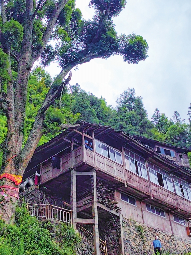 巡線隊(duì)員在村民家里排查用電隱患,屋子旁邊就是一棵千年楠木。