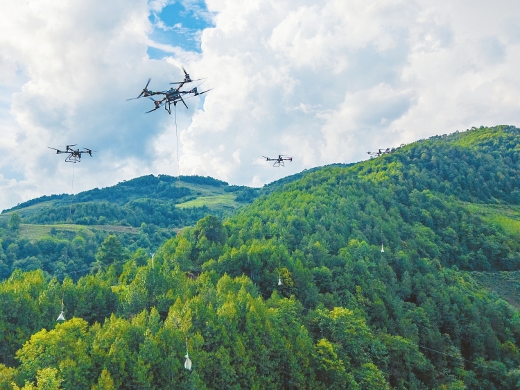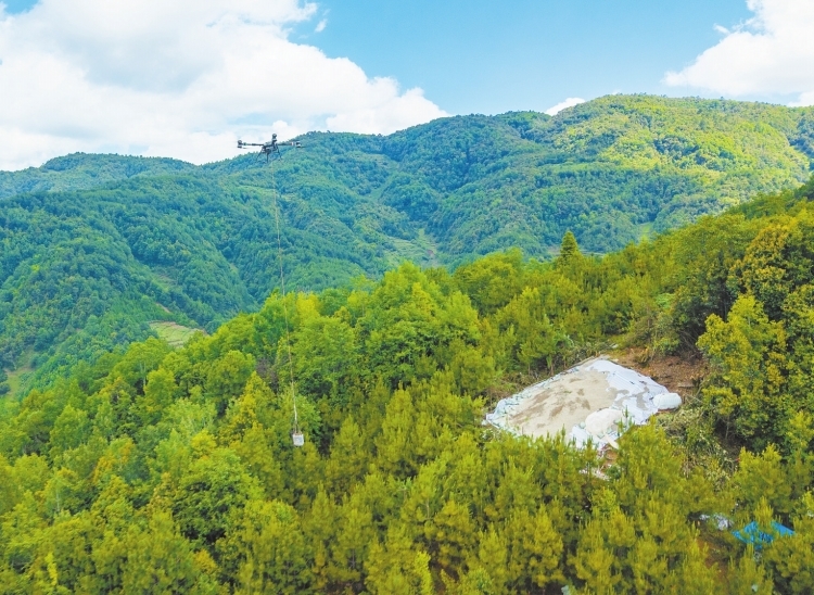 在工程中使用重載無人機(jī)集群運(yùn)輸,相較需要開辟林地的傳統(tǒng)方式,可減少近10000平方米的林木砍伐量,相當(dāng)于1.5個(gè)標(biāo)準(zhǔn)足球場。