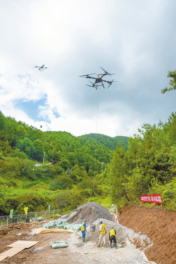 無人機(jī)集群吊起施工材料快速飛越群山。